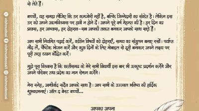 रायपुर। छत्तीसगढ़ के मुख्यमंत्री विष्णु देव साय ने परीक्षा में शामिल हो रहे छात्रों के लिए एक प्रेरणादायक संदेश ट्वीट किया है। CM साय ने अपने संदेश में कहा, “मेरे...