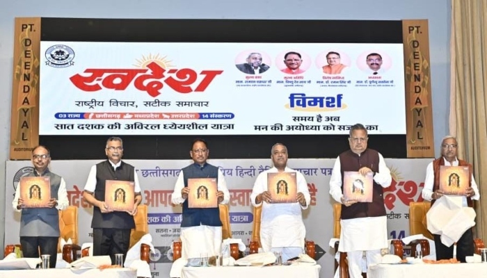 इस अवसर पर अयोध्या आंदोलन पर केंद्रित ग्रंथ "राम काजु कीन्हें बिनु" एवं छत्तीसगढ़ की लोक कला-संस्कृति पर आधारित पुस्तक का विमोचन मंच से किया गया। कार्यक्रम की अध्यक्षता मध्य क्षेत्र के संघचालक डॉ. पूर्णेंदु सक्सेना ने की। इस अवसर पर विधानसभा अध्यक्ष डॉ. रमन सिंह, स्वदेश पत्रिका समूह के संपादक अतुल तारे एवं प्रबंध संपादक यशवर्धन जैन मंच पर उपस्थित थे। मुख्यमंत्री विष्णु देव साय ने अपने संबोधन में कहा कि स्वदेश पत्र समूह ने अपनी सात दशकों की अविरल यात्रा में समाज में भारतीयता की भावना को पुष्ट करने का कार्य किया है। उन्होंने कहा कि स्वदेश समाचार पत्र आज भले ही नए कलेवर में है, लेकिन इसका इतिहास अत्यंत समृद्ध है। देश की आजादी के तुरंत बाद 1948 में अंत्योदय और एकात्म मानवतावाद के प्रणेता पंडित दीनदयाल उपाध्याय की परिकल्पना से इस पत्र का प्रकाशन आरंभ हुआ। हमारे देश के पूर्व प्रधानमंत्री भारत रत्न अटल बिहारी वाजपेयी भी इसके संपादक रहे।