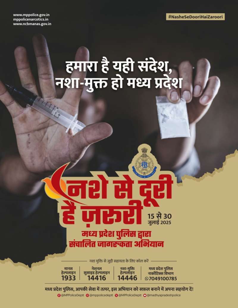 भोपाल, 15 जुलाई 2025। पुलिस महानिदेशक श्री कैलाश मकवाणा ने आज मंगलवार 15 जुलाई 2025 को पुलिस मुख्यालय, भोपाल में आयोजित प्रेस कॉंफ्रेंस में मध्यप्रदेश पुलिस द्वारा 15 जुलाई से 30 जुलाई तक चलाए जाने वाले वृहद नशा मुक्ति जन-जागरूकता अभियान ‘’नशे से दूरी-है जरूरी’’ का शुभारंभ माननीय मुख्यमंत्री डॉ. मोहन यादव के संदेश तथा अभियान के पोस्टर का विमोचन कर किया। डीजीपी मकवाणा ने कहा कि माननीय मुख्यमंत्री जी की प्रेरणा से समाज में नशे की प्रवृत्ति की प्रभावी रोकथाम के यह जनजागरूकता अभियान ‘’नशे से दूरी-है जरूरी’’ मध्यप्रदेश पुलिस द्वारा चलाया जा रहा है। उन्होंने कहा कि ड्रग्स- ये शब्द सुनते ही दिमाग में कई दृश्य उभरते हैं- दुर्बल शरीर, नशीली आंखे, धुऐं का गुबार और अंधकार। मादक पदार्थों के सेवन की लत कई युवाओं को खोखला कर उनके परिवारों को भी बर्बाद कर रही है। देश एवं प्रदेश के शीर्षस्थ राजनैतिक नेतृत्व भी इस विकराल समस्या से चितिंत एवं इसके निदान हेतु प्रयासरत है। हम सभी की ये नैतिक जिम्मेदारी है कि इसके दुष्प्रभावों से विशेषकर किशोर बच्चों और युवाओं को अवगत कराएँ और नशे से दूर रखें। उन्होंने कहा कि ‘’हमारा है यही संदेश- नशा मुक्त हो मध्यप्रदेश’’। इस अवसर पर विशेष पुलिस महानिदेशक सी आई डी पवन श्रीवास्तव, अतिरिक्त पुलिस महानिदेशक नारकोटिक्स के.पी.वेंकटेश्वर, पुलिस महानिरीक्षक ए.एन. ओ. डॉ. आशीष, पी एस ओ टू डीजीपी विनीत कपूर, सहायक पुलिस महानिरीक्षक संजीव कुमार कंचन एवं एसओ टू डीजीपी मलय जैन उपस्थित रहें।