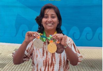 नागपुर, 26 फरवरी। संतरा नगरी की कु. दिव्या पिल्लई ने पिछले माह नासिक के वीर सावरकर स्विमिंग पूल में आयोजित प्रथम यूनाइटेड नेशनल मास्टर्स गेम्स 2026 में शानदार प्रदर्शन करते हुए स्वर्ण पदक: 100 मीटर बैकस्ट्रोक, रजत पदक: 400 मीटर फ्रीस्टाइल, कांस्य पदक: 200 मीटर फ्रीस्टाइल आदि पदक अपने नाम किए।