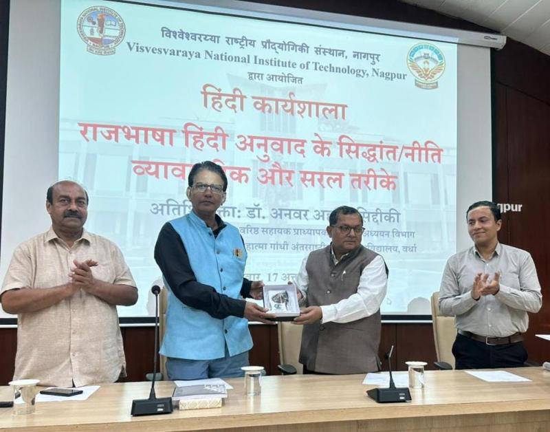 सीनेट हॉल में सीनेट हॉल में आयोजित इस कार्यशाला में,वीएनआईटी के कर्मियों को "राजभाषा हिंदी में अनुवाद के सिद्धांत / नीति: व्यावहारिक और सरल तरीके" विषय पर डॉ अनवर अहमद सिद्दीकी , वरिष्ठ असिस्टेंट प्रोफेसरअनुवाद अध्ययन विभाग,महात्मा गांधी अंतरराष्ट्रीय हिंदी विश्वविद्यालय,वर्धा ने मार्गदर्शन किया| समारोह के अध्यक्ष और संस्थान के प्रभारी निदेशक प्रो. ज्ञानप्रकाश सिंह ने अतिथि वक्ता का पौधा,स्मृति चिन्ह और पुस्तक देकर सम्मान किया|